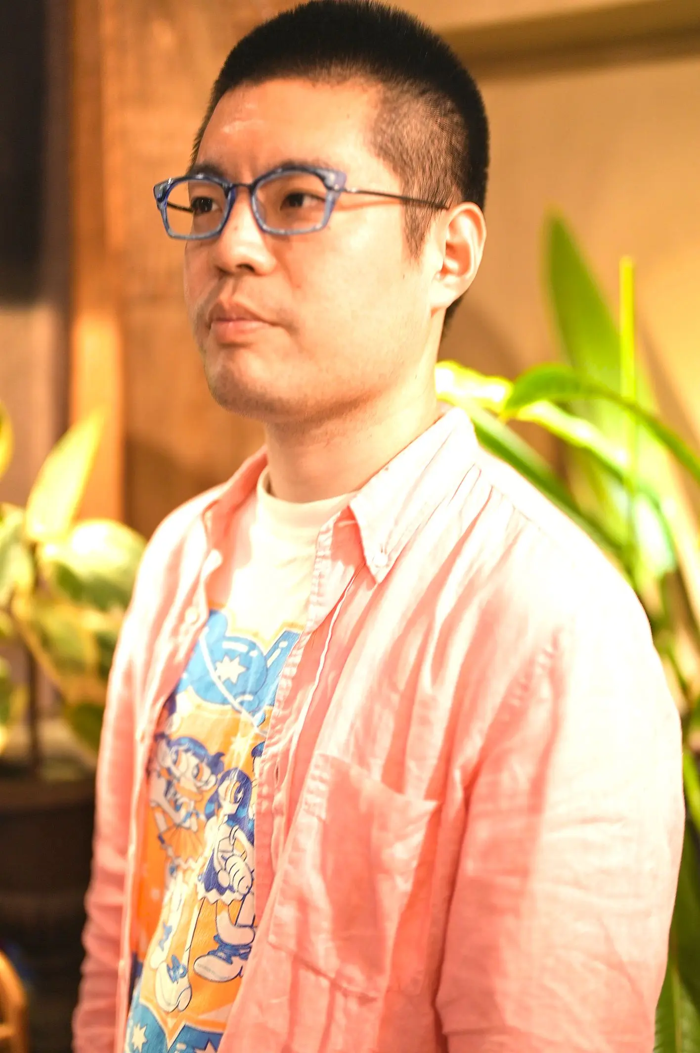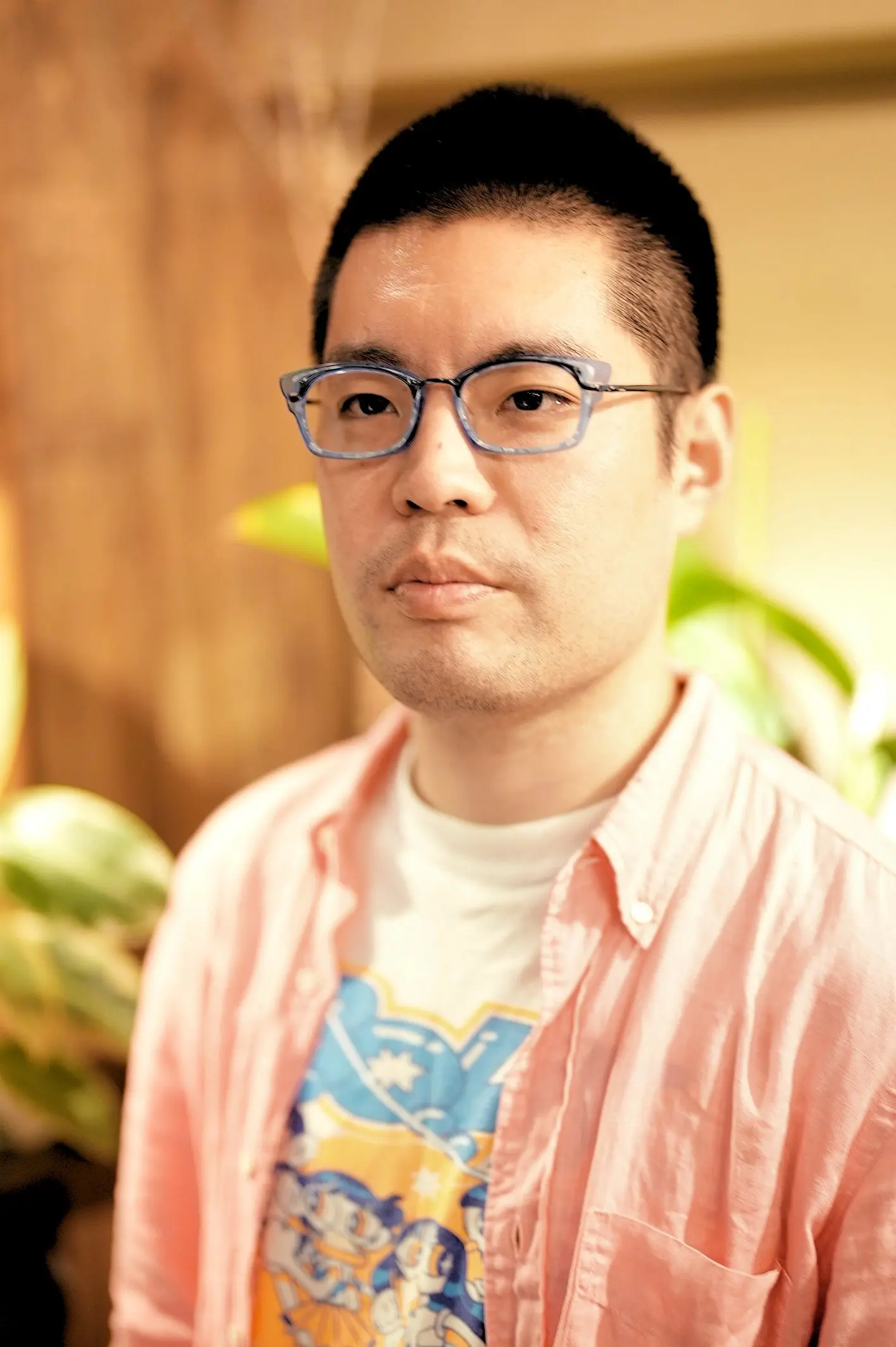 マットなピンクと複数の色を組み合わせた遊び心溢れるデザインで、木崎様のセンスにぴったりでした。アメリカのお菓子を思わせる発色の良さは、見るだけでワクワクし、木崎様が掛けると本当に楽しくお似合いになります。