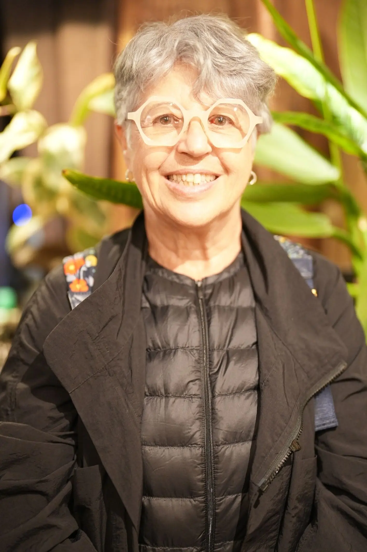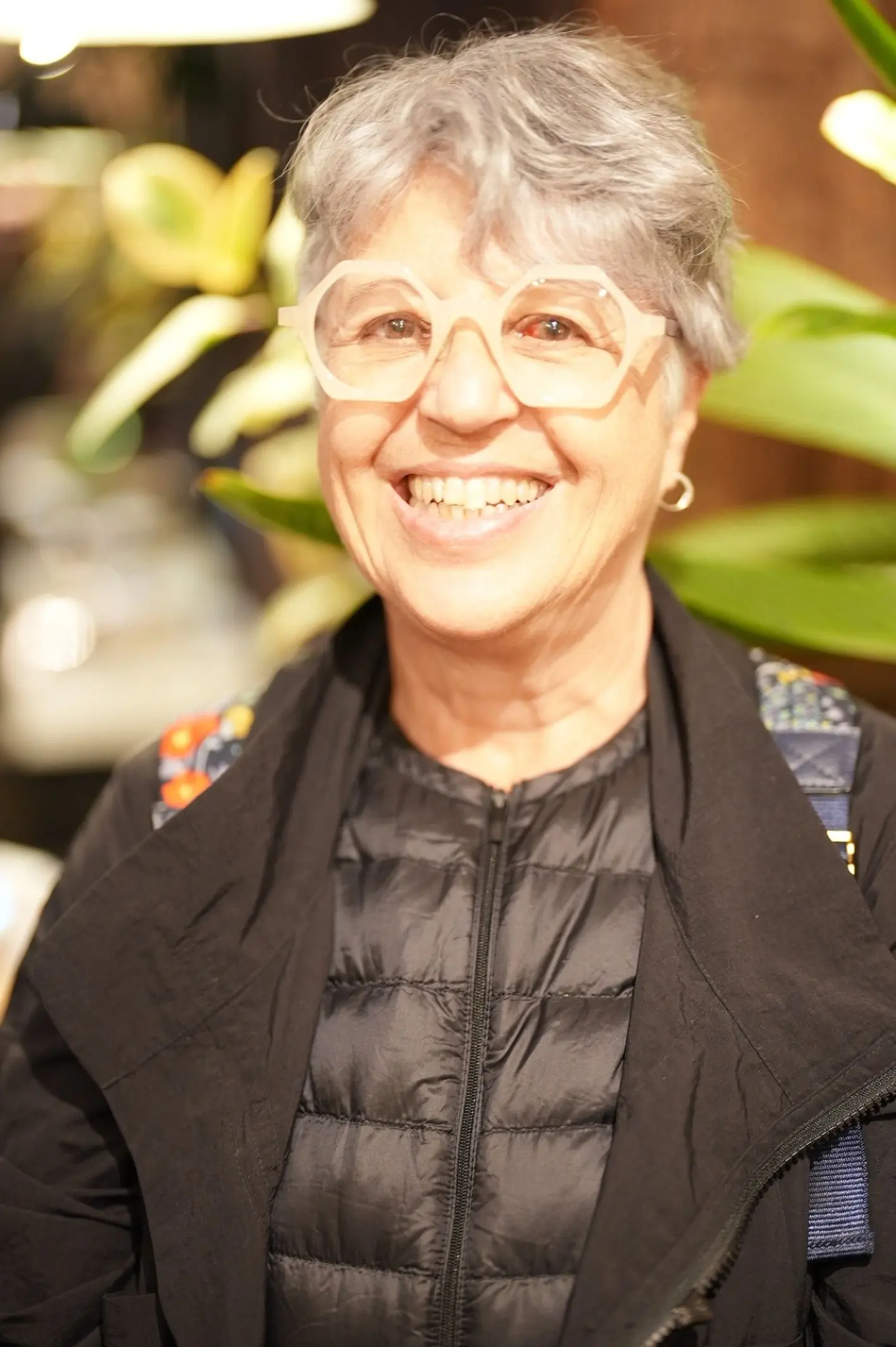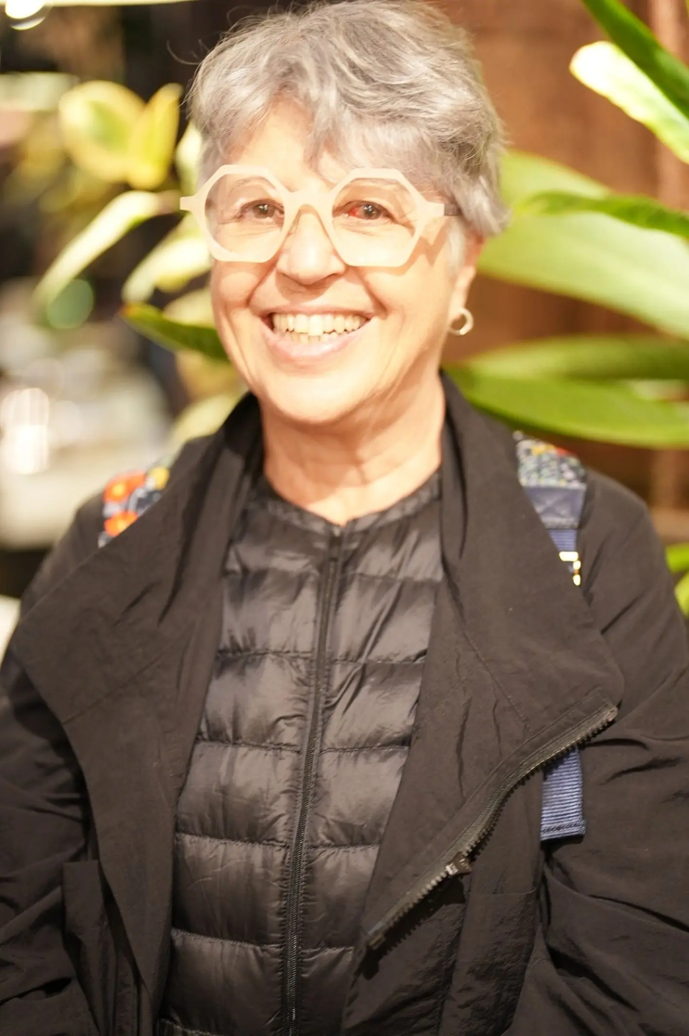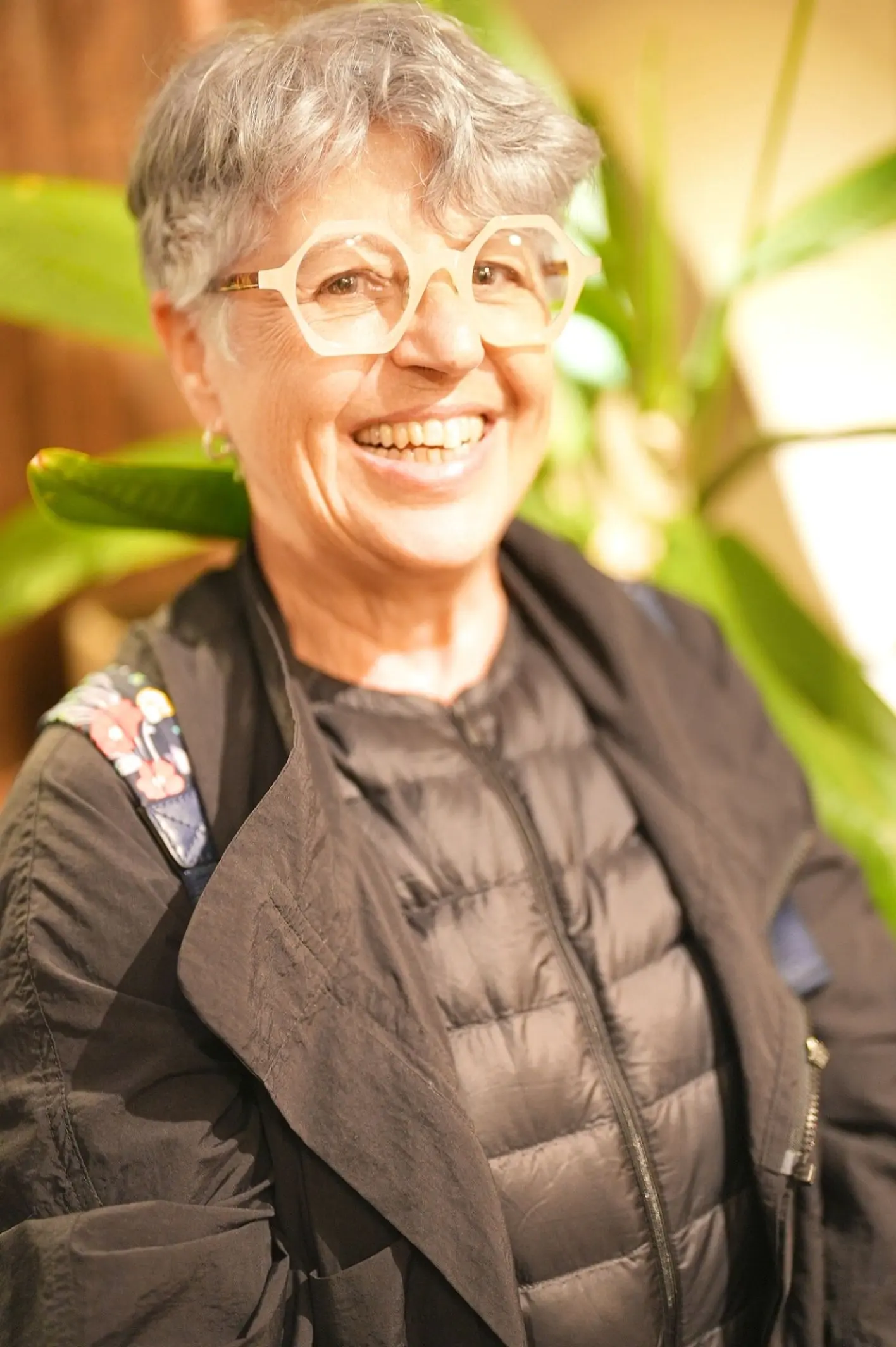 C21は、クラシカルなセルフレームに大胆な多角形のフォルムを取り入れ、ユニークな生地使いが目を引くデザインです。カラーレンズを組み合わせることで、さらなる個性が引き立つこのフレームは、Michele様の品のあるスタイルにぴったりと寄り添います。