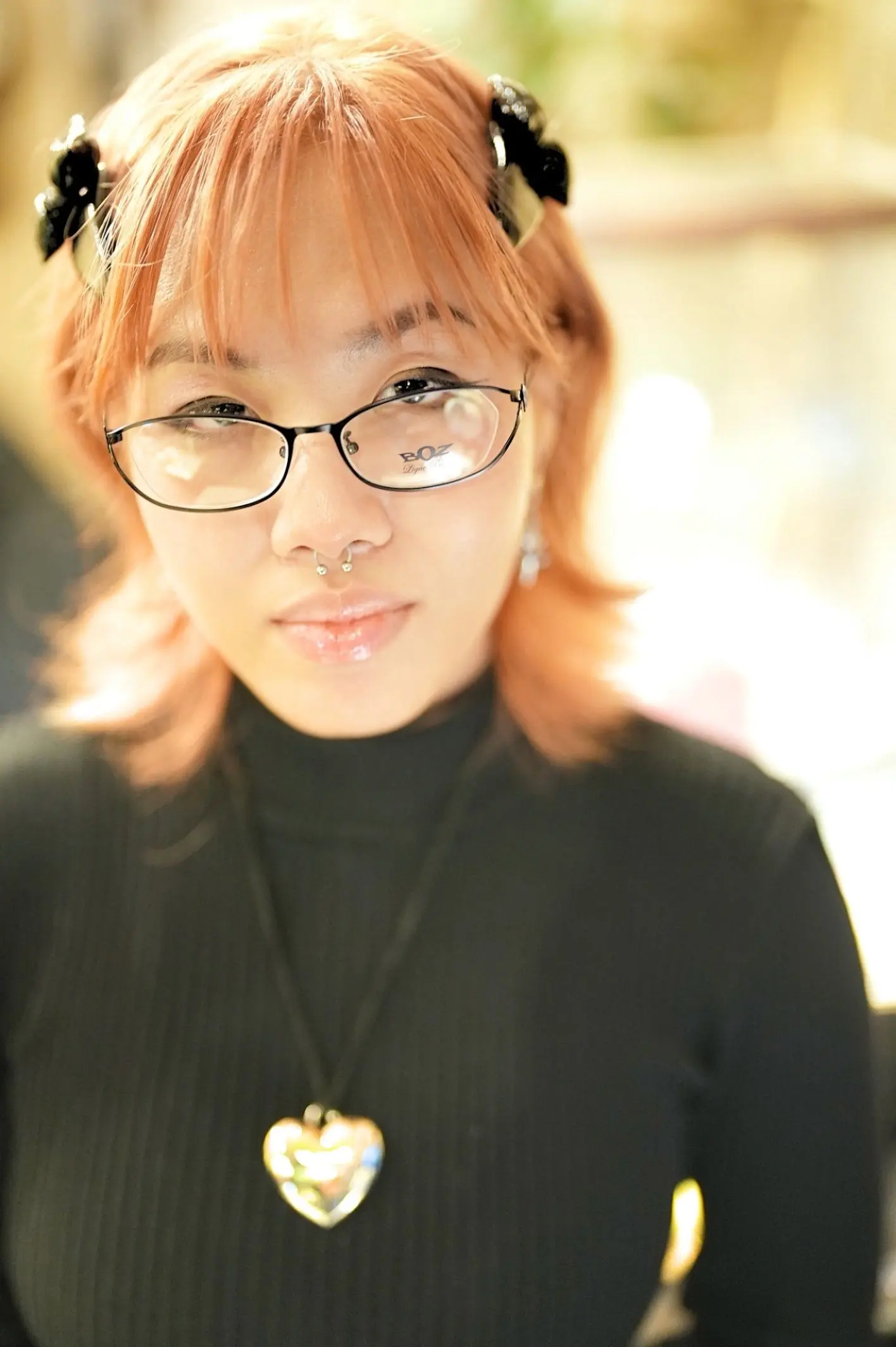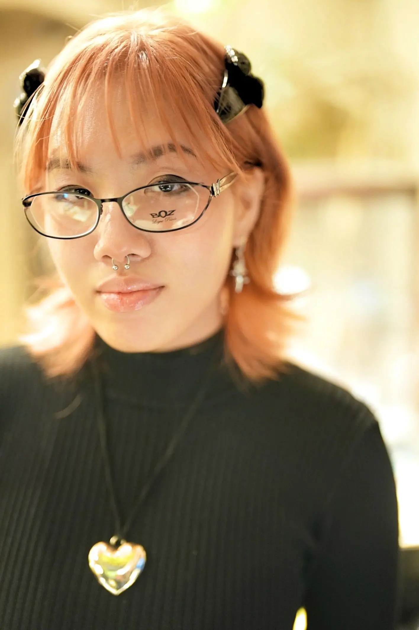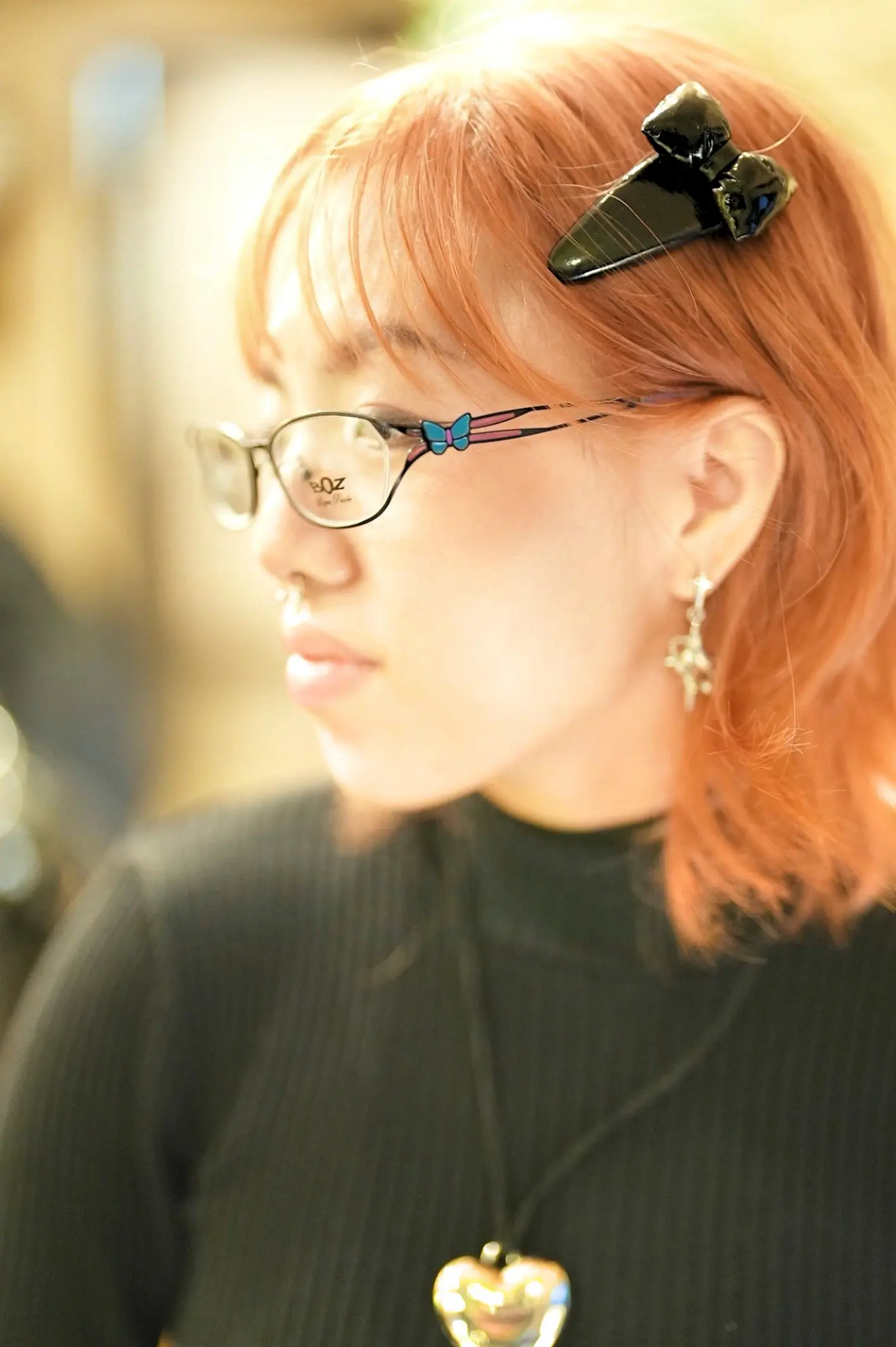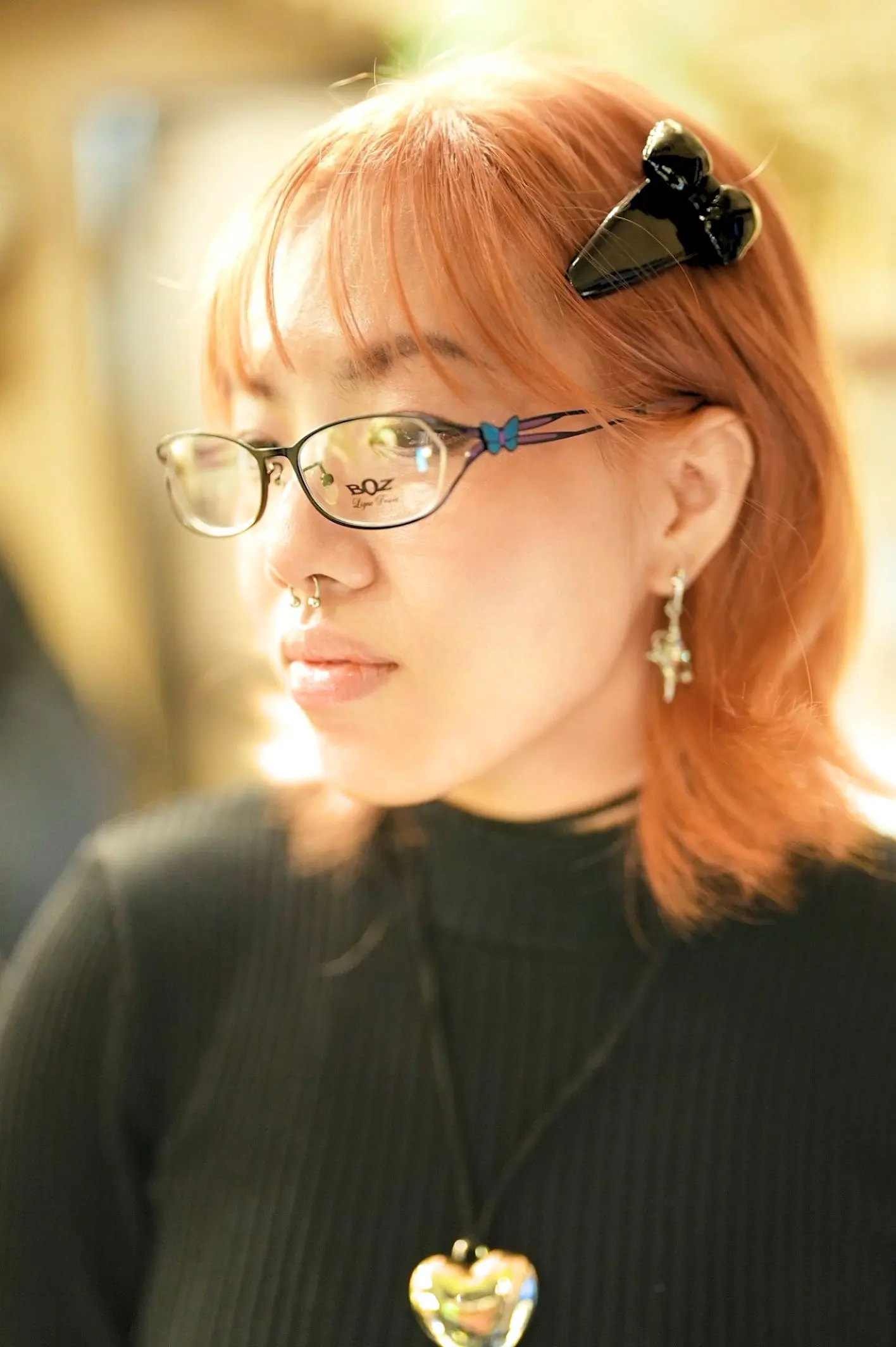 こちらBOZの【GLITTER 0040】は、シンプルなラインでありながら、エキゾチックでフェミニンな魅力を放つ逸品。メタルフレームは一見控えめに見えますが、横顔に映える蝶の装飾やステンドグラス状に施された七宝細工は、細部にまでこだわったデザインが光ります。これにより、panielle様の個性と見事に調和していると思います!!