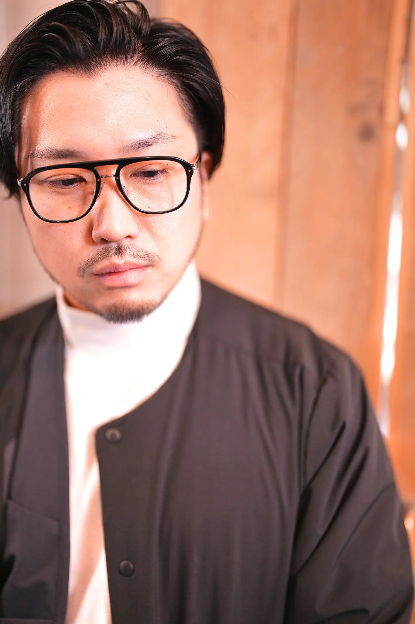 当店のメガネを様々ごらんいただき、ご購入いただいたのが【STAN C1】こちらは、ヨーロッパで確固たる地位を築くドメスティックブランド YELLOWS PLUS の一品。クラシカルでありながら、やや癖のあるデザインが個性的なツーブリッジ仕様のティアドロップ型コンビネーションフレーム。トップライン裏側にブリッジ一体型のメタルバーを沿わせたデザインが特徴で、彫金や芯金の透け感が高級感を引き立てています。一見して目を引く存在感と、掛けることで感じられる軽やかさが魅力です。