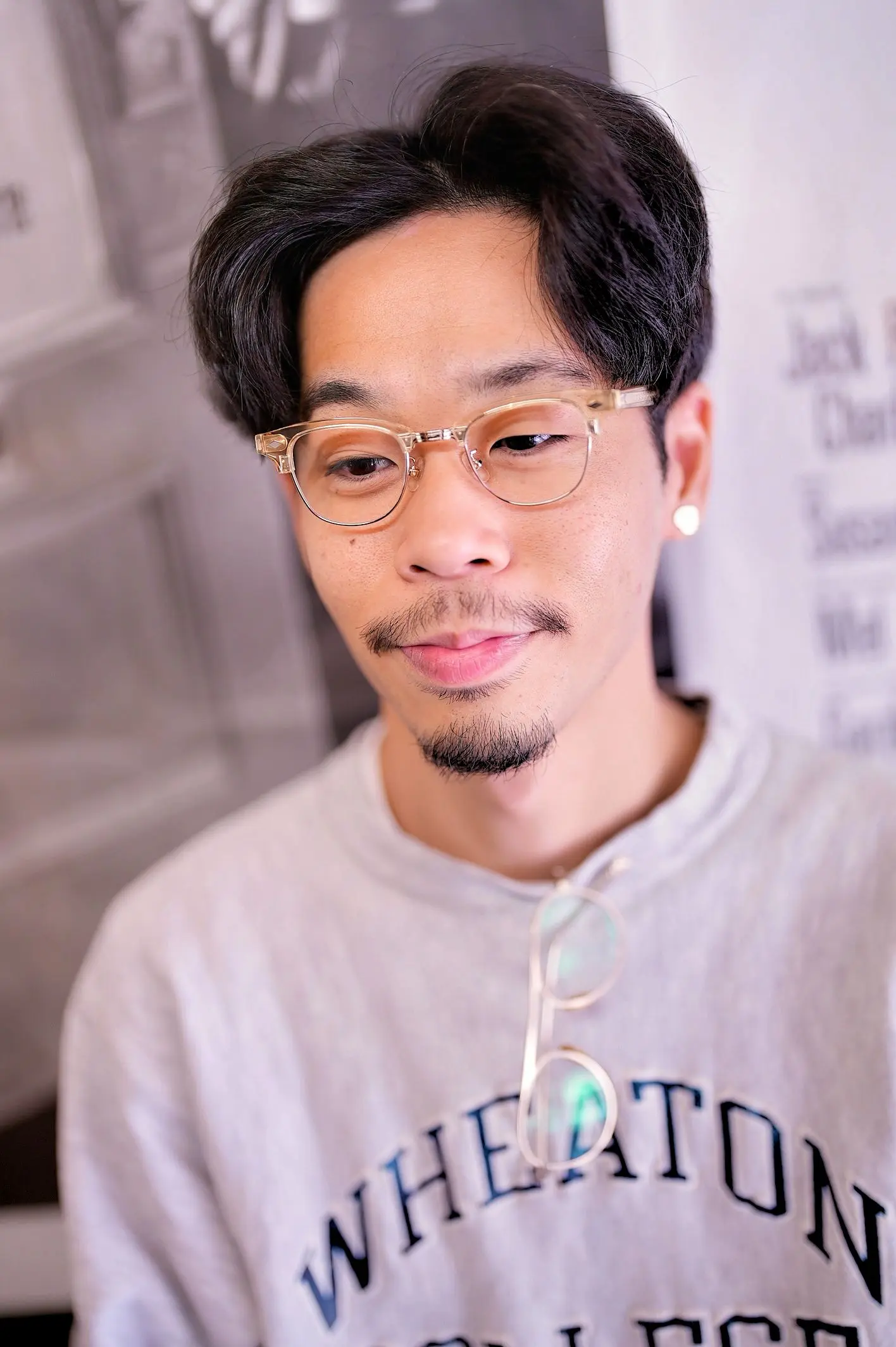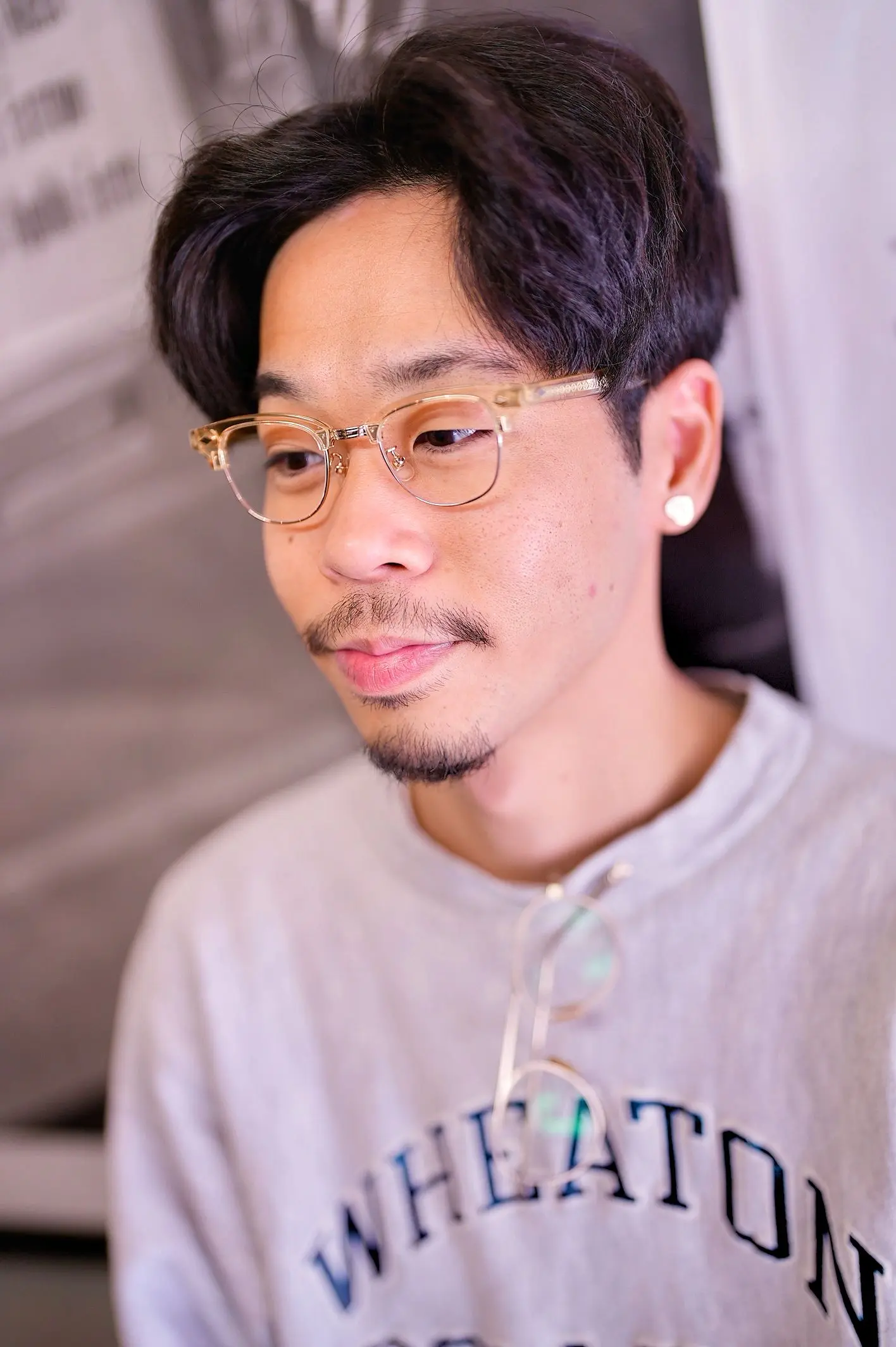 こちらをお求めいただきました、T様です。今回はご自身のお客様からのご紹介で初めてご来店くださいました。普段は古着屋さんでお仕事をされていて、身に着けるものへの目線やこだわりが自然と感じられる方で、お話の中で、以前からサーモントタイプのフレームに興味を持っていたものの、なかなかサイズが合わず、しっくりくるものに出会えていなかったとのことでした。