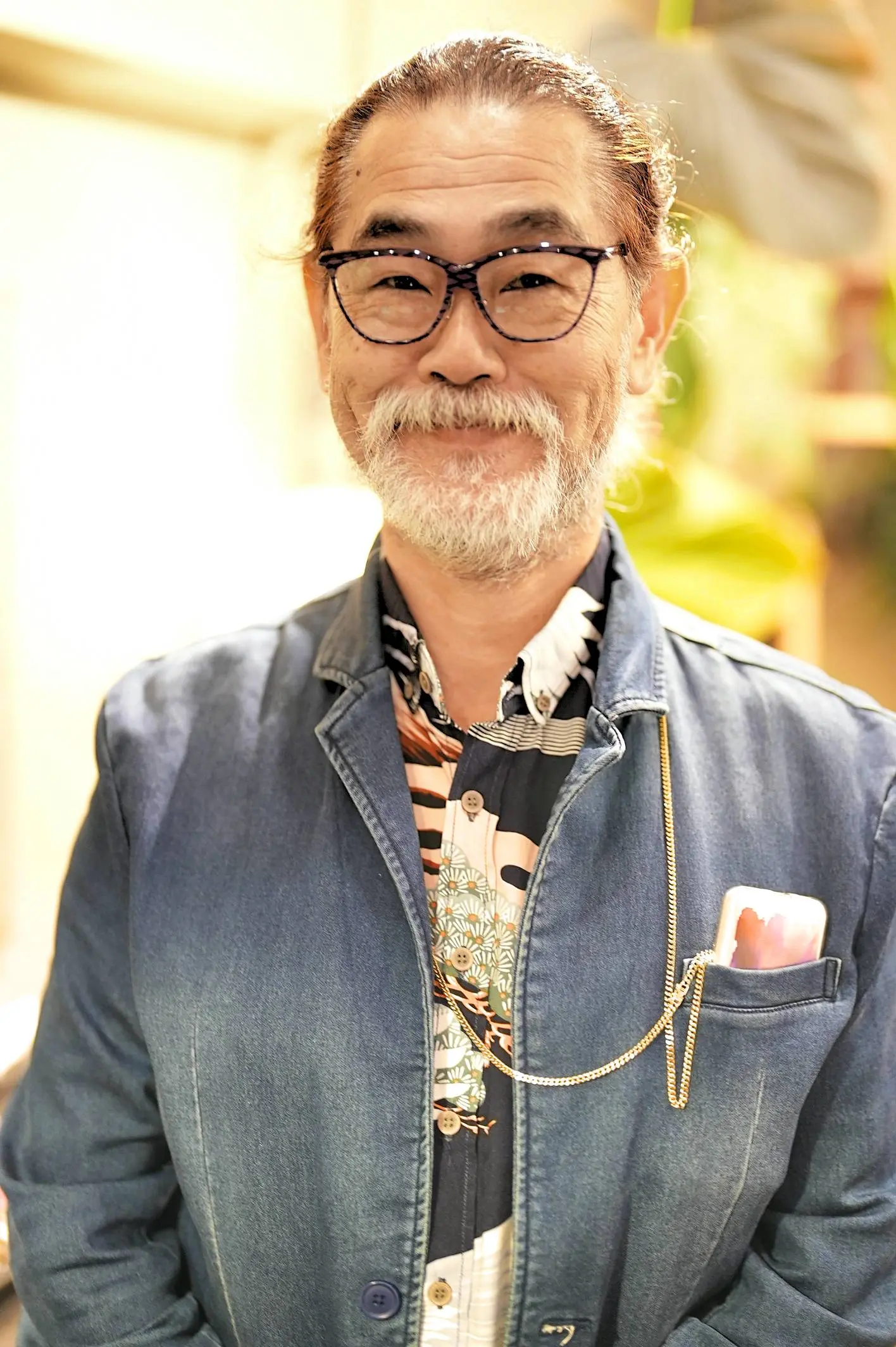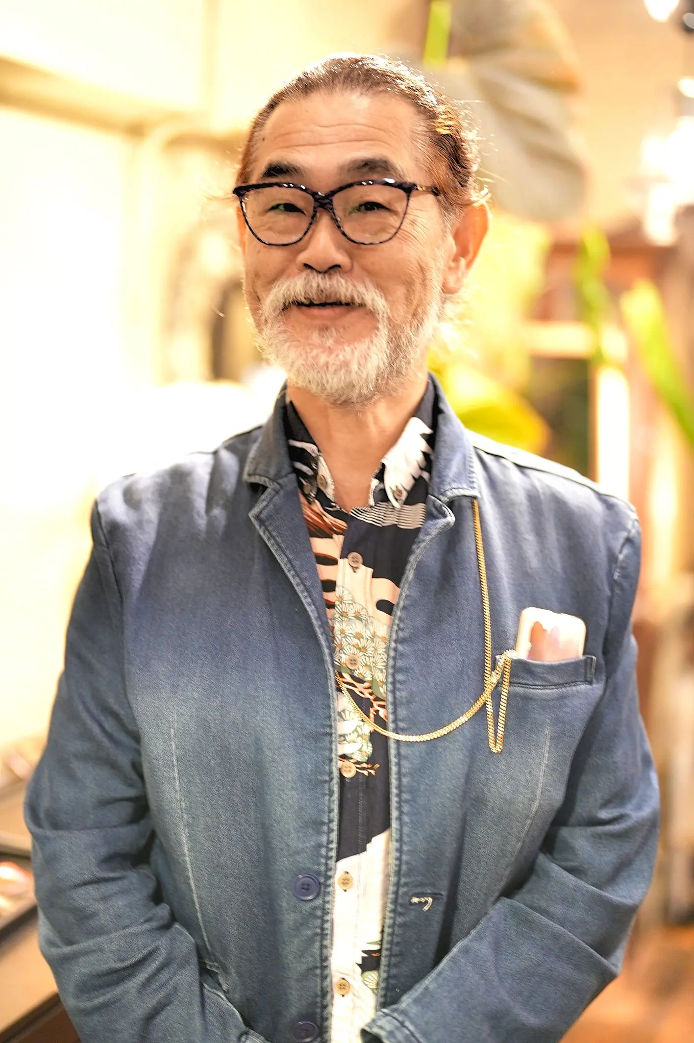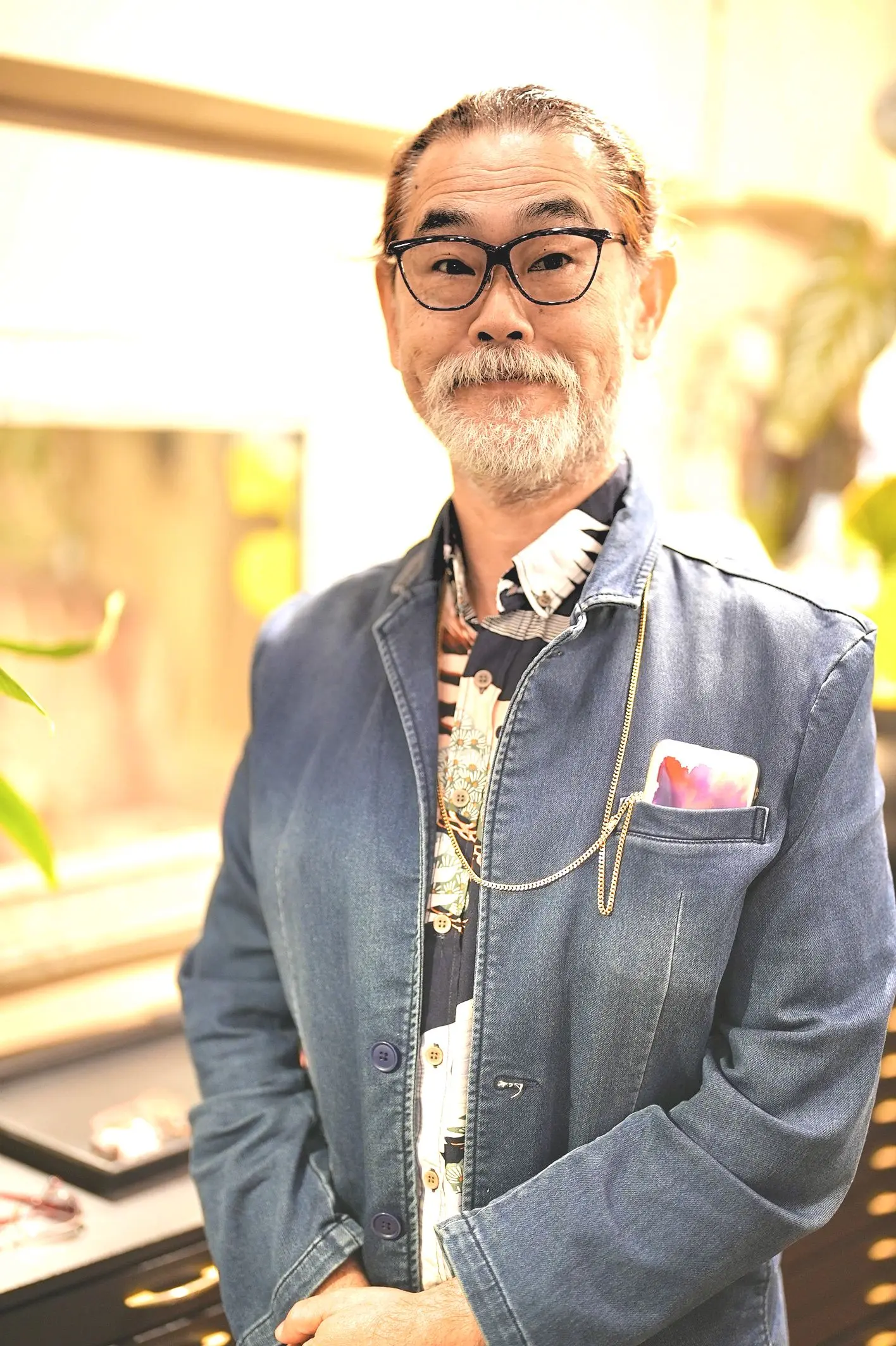 今回は「自分の感覚で選びたい」とのことで、数ある中からご自身のセンスで選ばれたのが、AXELSの“CONNY”というモデル。西ドイツ製のヴィンテージハンドメイドで、玉虫色のフロントが角度によってさまざまな表情を見せてくれる、まさにアクセルらしいPOPでアーティスティックな一本です。カラフルなセル生地の色合いもB様の装いに程よく調和していて、目元に楽しい彩りを添えていました。
