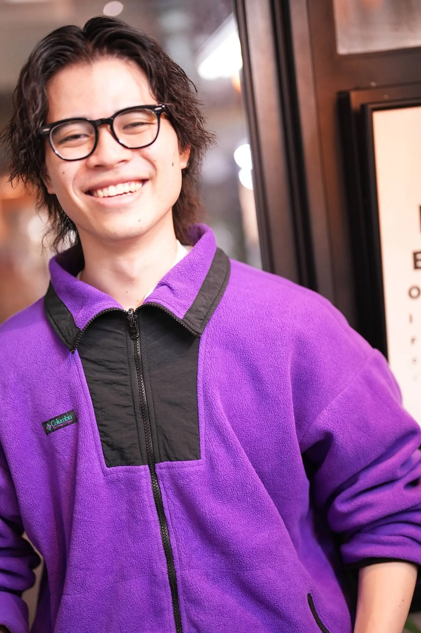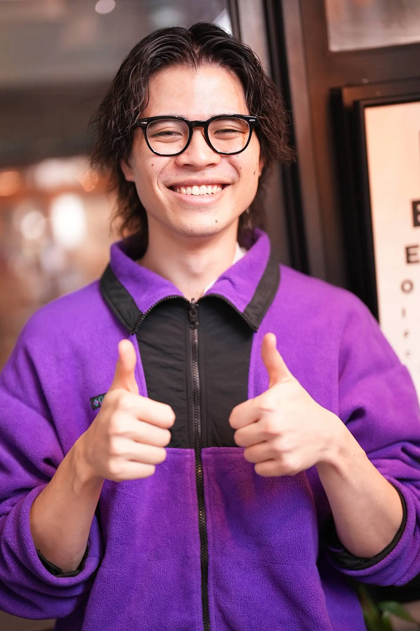 お伺いすると、K様、これまで6年間ずっとコンタクトレンズがメインだったそうで、これからはメガネも主役として楽しんでいきたいとのこと。ご予算などもお伺いし、新宿店のフレームの中からいくつかご提案。最終的に、もう一つ候補に残っていたレイバンのメタルフレームと最後までお悩みでしたが、「今後、古着を中心にファッションを楽しんでいきたい」というK様のワードローブの方向性をお聞きして、こちらのHAWKEYE(ホークアイ)をお選びいただきました。