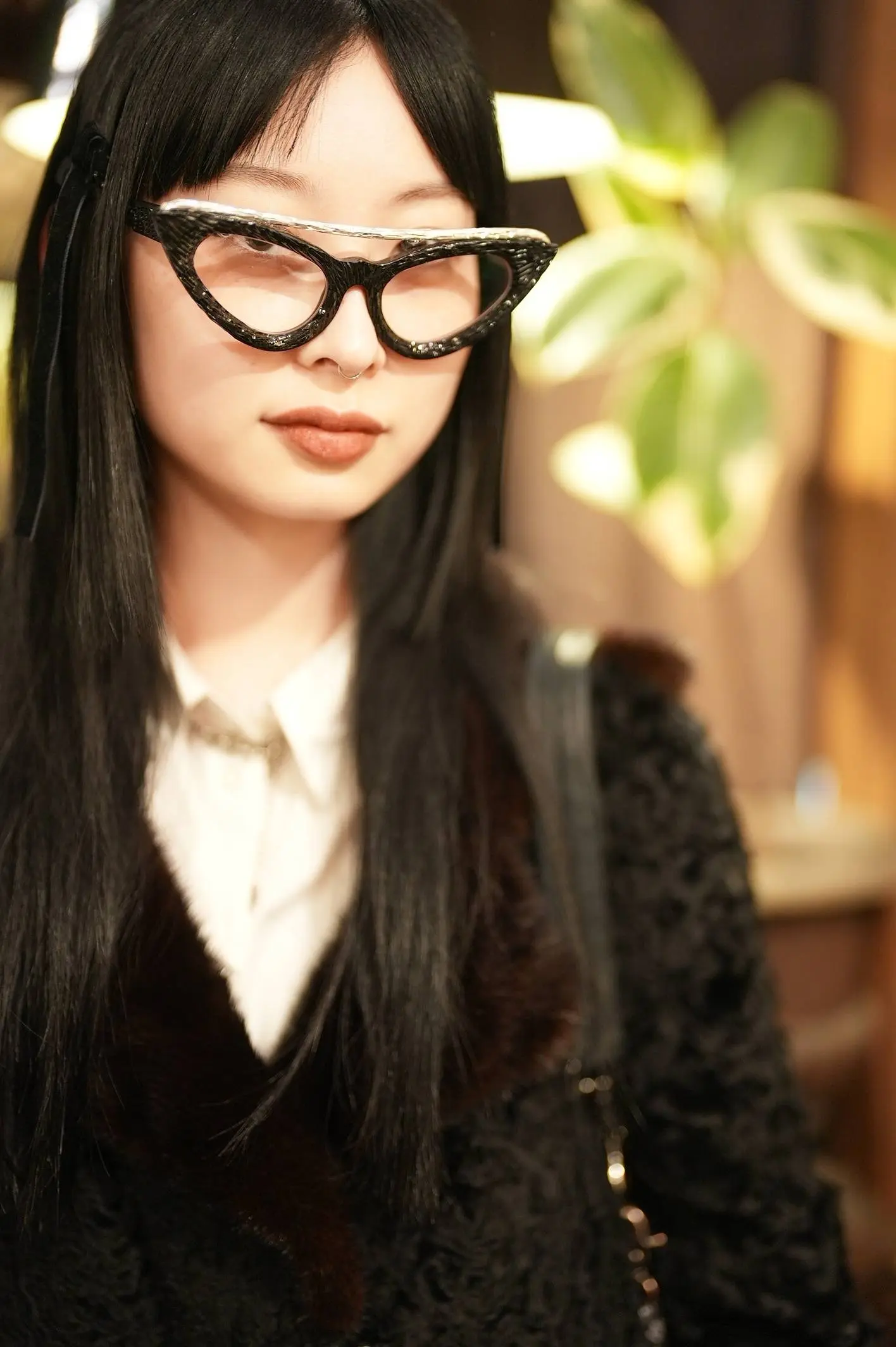 KUBORAUMは、2012年にベルリンで生まれた革新的なアイウェアブランド。ブランド名はドイツ語で「キュービックルーム」を意味し、アイウェアを視力矯正具ではなく「マスク」として捉え、個性や特徴を際立たせる独自のコンセプトを持っています。このMaske Y3 BM LTDは、既にインパクトのあるY3モデルをベースに、装飾パーツでデコり、荒々しい削りを入れた、遊び心どころかやり過ぎなデザイン。まさにクボラムらしい超限定バージョンです。正直、このメガネはとても難しい。誰でも似合うフレームではありません。ただayano様が掛けると、その個性的なデザインがすっと馴染んで、本当にお似合いでした。