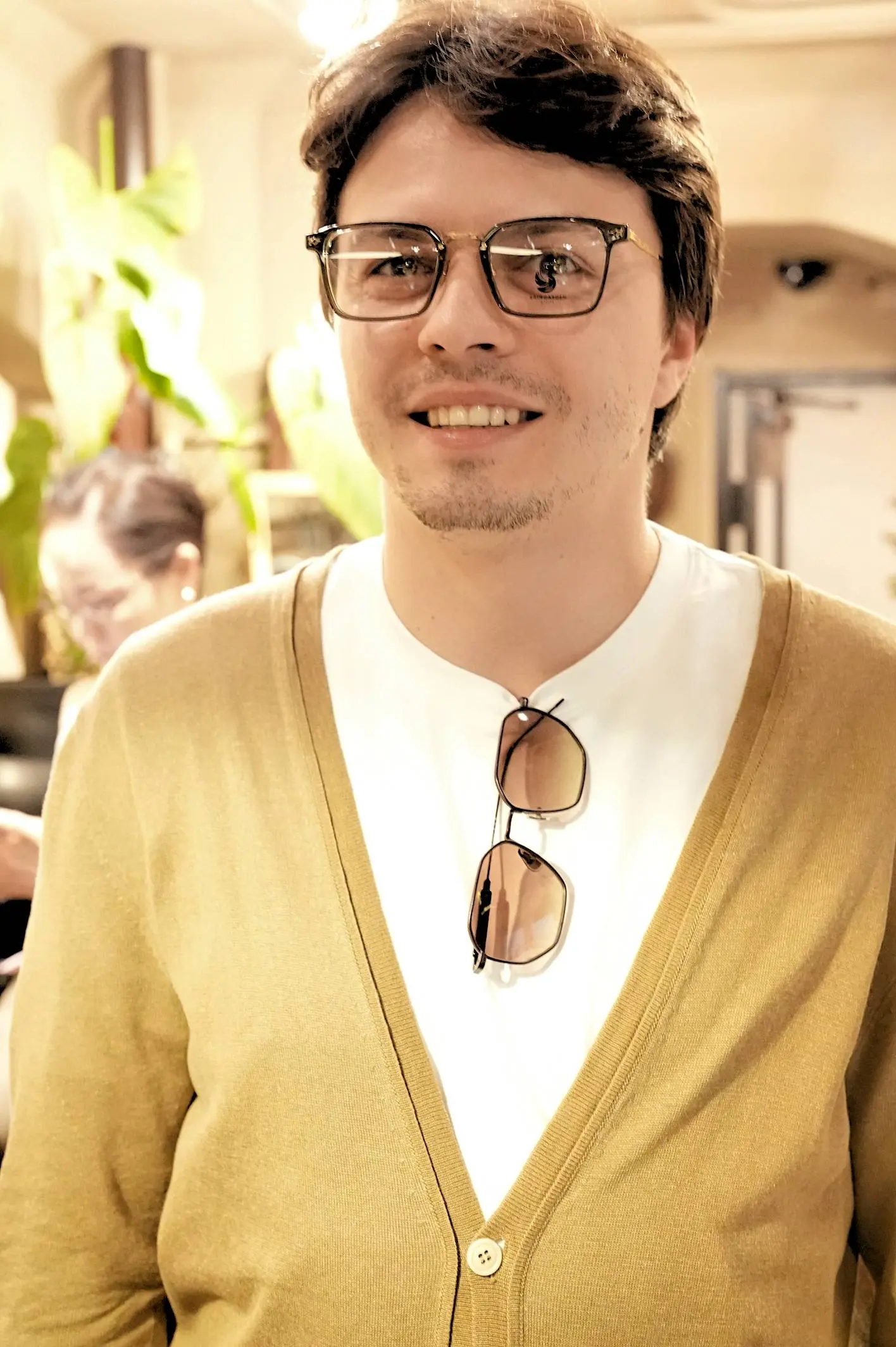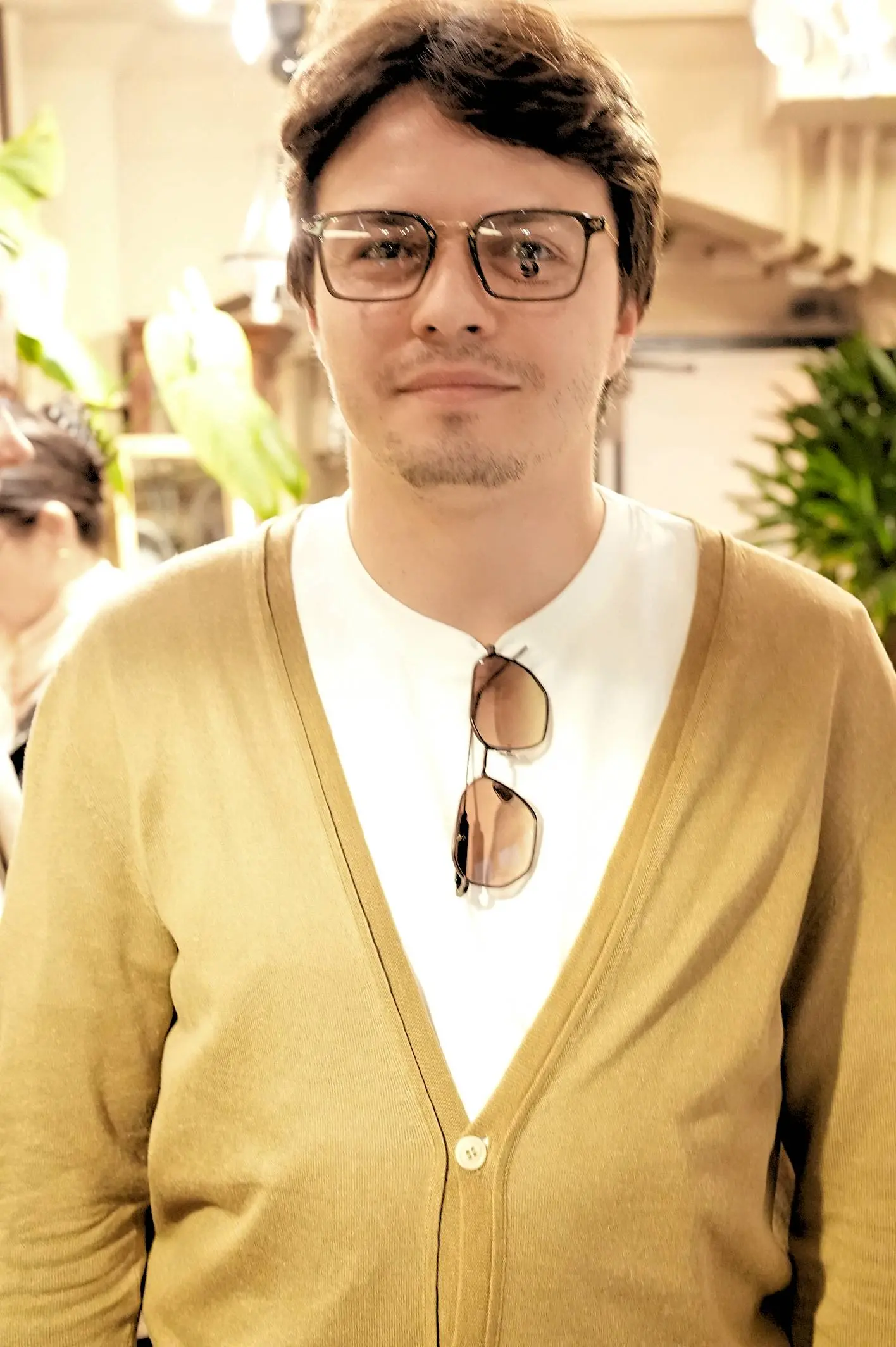 このモデルはスクエアシェイプのフロントにアセテートとチタンを組み合わせたコンビフレームで、素材の異なる質感が絶妙な調和を見せています。チタンの軽さと強度を活かしながら、アセテートの色彩と艶がフレームに表情を与えており、すっきりとした知的な印象の中に、素材ならではの温かみが漂います。Igor様のスタイルにも自然と馴染んでいました。