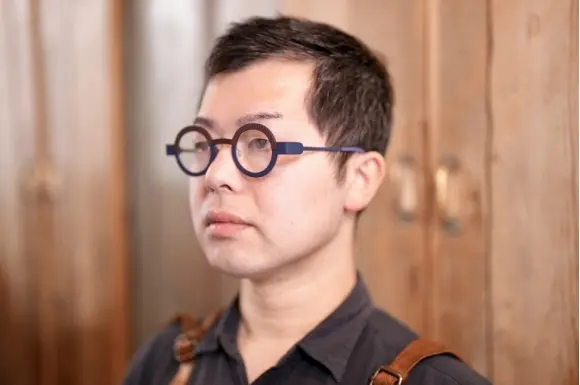 掛ける人の個性、魅力を引き出す、センス抜群なフレンチブランド、アンバレンタインのVAGUOです。波打つようなブロー部分のデザインがユニークで遊び心のあるコンセプト「ONDULO」モデルです。視線を引き寄せるアーティスティックなデザインに配色、まさに“掛けるアート”とも言えるフルチタン製のラウンド型フレームです。