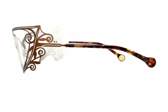 花や雲など自然をモチーフにし、エキゾチックでフェミニン、デコラディブなデザインは、まさにアートなBOZのTRESORです。顔を覆うようなカーブが効いた、ラップアラウンドタイプのシートメタルフレームです。超個性派のぶっ飛びメタルフレーム。薔薇をモチーフとした一本は、パーティー用か、インテリアか、はたまた仮面舞踏会用なのか!?。これを普段使いしようというツワモノの方、お待ちしております。カラーレンズを入れると完全に舞踏会仕様ですね。