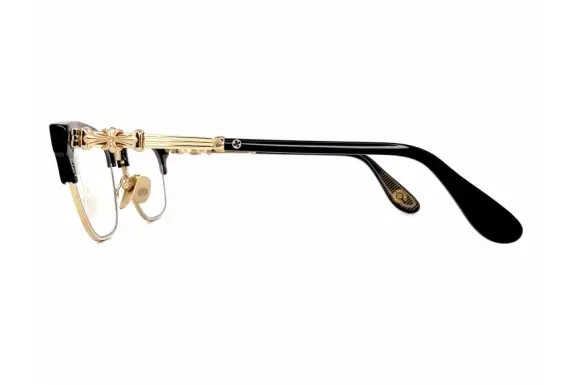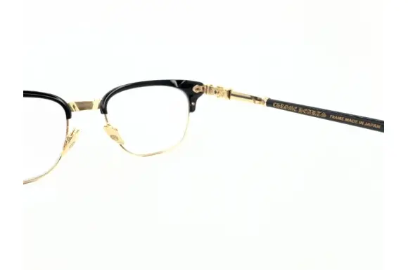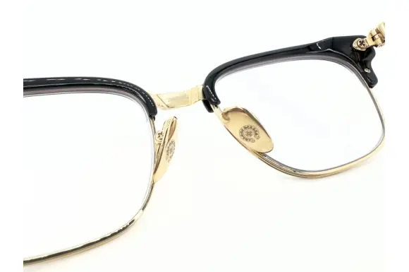 シルバー&レザーの帝王クロムハーツのBONENNOISSEUR Ⅱ(2)です。クラシカルで独特な雰囲気を持つサーモントタイプのコンビネーションフレームに、豪奢なシルバー925のモチーフが装飾されたクロムハーツならではのアイウェア。トップライン上部にはシルバープレートが配され、フロントサイド、テンプルにはクロスモチーフが鎮座。ビスにまでクロスデザインが入っていて、一目でそれとわかる存在感のあるフレームです。