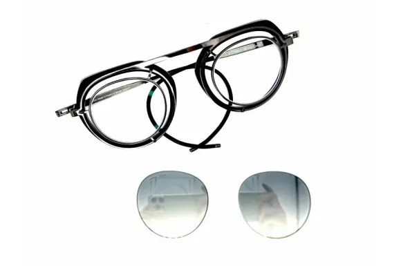 テンプル(つる)を交換できる独創的なデザインが特徴で、「服を着替えるようにテンプルを変える」というコンセプトを持つ、2006年フランス発のアイウェアブランドDILEM(ディレム)の3B00Dです。二重構造のメタルフロントに、アセテートフード(風防)を合わせた三重フロント構造が抜群にスタイリッシュモダンなアイウェア。着脱可能なテンプルはケーブルテンプル(縄手式テンプル)をセレクトしています。カラーレンズ仕様でもカッコイイです。