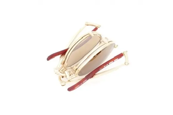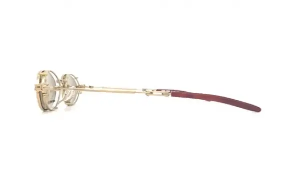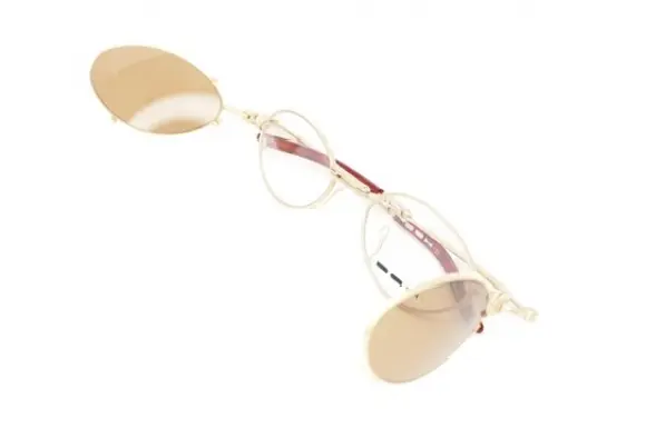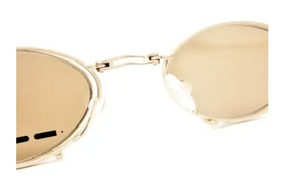 DOXの非常に凝ったデザインがユニークな折りたたみ式のオーバル型メタルフレームです。かなりコンパクトに折りたたむことができます。ジャンポールゴルチェのようなギミックの効いたファッショナブルな一本。2枚レンズの複式跳ね上げ仕様で、前枠にはカラーレンズが入っていますが、こちら跳ね上げるのではなく、跳ね広げるという斬新なスタイルです。さらにこちらじつは、かなりシンプルなクリップ式ですので、カラーレンズ自体が簡単に取り外せます。見た目の個性と機能性を兼ね備えた、実用的な多機能フレームです。