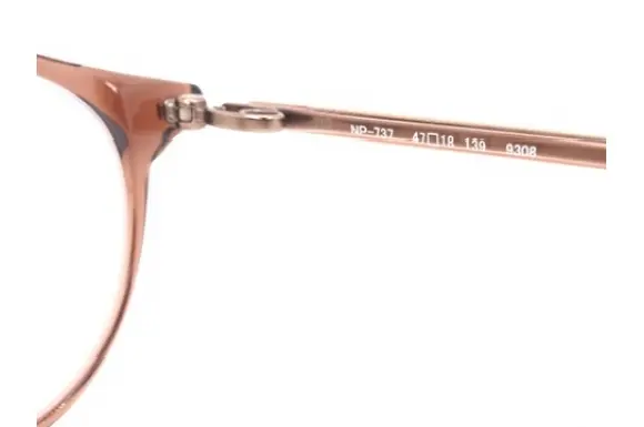 フォーナインズ、NP (ネオプラスチック)シリーズのNP-737です。プラスチックの柔らかい印象と、メタルのような繊細な表情を併せ持った、レディースラインのプラスチックフレームです。フロントはベーシックなボストンシェイプ。レディースフレーム専用の独自機構であるU字パーツが理想的なフレームバランスをもたらし、装飾性を高めています。掛ける女性の表情を引き立てる、細身のフレームラインが際立つシリーズです。フォーナインズならではの機能性、品質、デザインを実感できるフレームです。