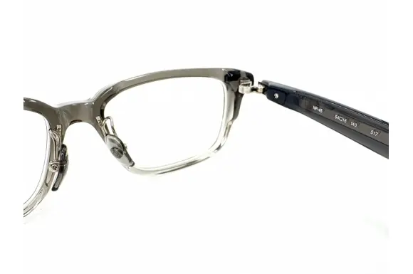 フォーナインズのNP-45です。NPM-95シリーズの系譜となるプラスチックフレームで、8mm厚の生地を採用することにより強度と安定感、存在感があるスクエア型セルフレームとなっております。フロントトップラインがほんの少し角ばっており、抜群のかけ心地の中に個性も併せ持つモデルです。
