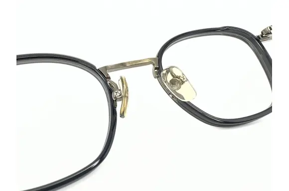 フォーナインズのM-48です。“ブリッジからリム、そして智元まで。これまでのフォーナインズスタイルとは一線を画す、新しいデザインアプローチ”から生まれた、Mシリーズのコンビフレーム。メタルリム内側からセル枠をはめ込んだ、クラシカルでオーセンティックなデザインをベースに、逆アールヒンジやクリングス仕様の曲面パッドなど、独自機構をふんだんに盛り込むことで、フォーナインズならではの快適なかけ心地を実現しています。