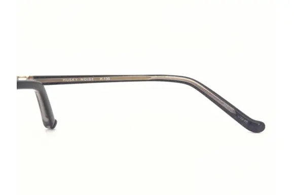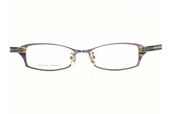 SOLID BLUEのデザイナー金子正嗣氏によるレディースブランド、ハスキーノイズです。「掛け心地の良いベーシックなスタイルを基本に、コレクション毎に異なったアソビゴコロを加え、オン・オフを問わず掛けられるフレームを提案しています。」。モデルH-130です。シートメタルのフロントに、プラスチックテンプルを合わせたコンビネーションフレーム。ヒンジパーツやラメの入った色使いが女性らしい一本です。