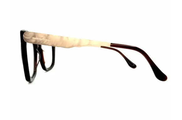 遊びを知り尽くしたフィアットの御曹司ラポ・エルカーンのコレクション、Italia Indipendent(イタリアインディペンデント)のアイウェア。イタリア車、フィアットの内装と同じベルベットを使用するなどユニークアイデアを眼鏡で表現するブランドです。天地幅が超たっぷりで、大振り、インパクトのあるウェリントン型セルフロントに、独特な質感のあるシートメタルテンプルを合わせた、コンビネーションフレームです。鼻あてがごく小さいヨーロッパ仕様ですので、鼻筋がかなりしっかりした方以外は、イタリアインディペンデント独自の、可動式鼻盛り(3500円)がオススメです。