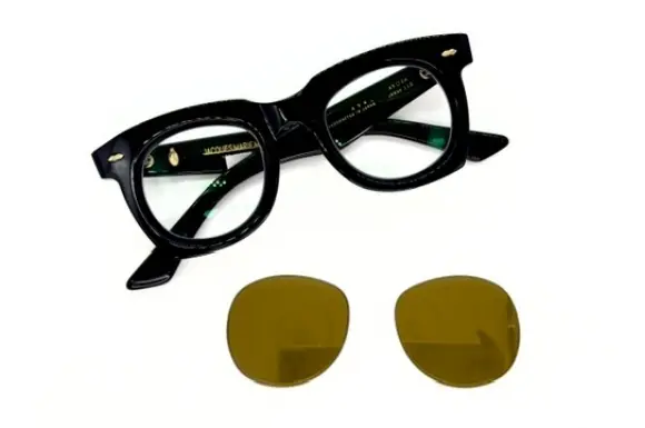 さらに、アールデコ調のデザインを施したテンプルの芯金(ワイヤーコア)や、ダブルアローヘッド、スフィア型のオリジナルヒンジパーツを採用し、高級感をさりげなく演出しています。フレンチヴィンテージの要素を色濃く残し、1940年代のフランスのクラシックフレームに見られる丸みのあるレンズとエッジを立たせた角ばったフレームのコントラストが特徴。重厚感のあるフロントはテレビジョンカットで仕上げられ、素材の厚みが際立つデザイン。