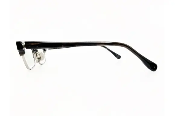 ジャポニスムのJN-660です。フロントメタルリムへはレコードをイメージした繊細なラインが彫り込まれています。ヨロイを貫通する金属製スクエアーパイプは日本のモダニズム建築からインスパイアされたアイコンです。シンプルで均整のとれた雰囲気のブロー型コンビネーションフレームです。オリジナルの板バネを採用、パットアームはβチタン製で快適にかけていただけます。