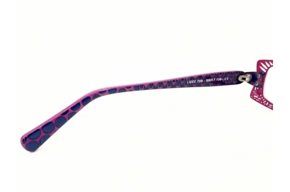 こだわりのディテールに、繊細でカラフルなデザイン、美しくエレガントな雰囲気が魅力のラフォンより、LUXEです。レース状の意匠が素敵なメタルフロントにアセテートテンプルを合わせたコンビネーションフレームです。テンプルの生地やデザインもとても素敵。ラフォンらしい妖艶でファッショナブルなコンビネーションフレームです。