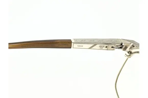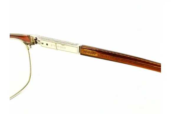 LEISURE SOCIETY (レジャーソサエティー)のSTANFORDです。レジャーソサエティーは、カリフォルニアを拠点とし、ルイヴィトンなど、ラグジュアリーブランドのアイウェアデザインを手掛けるBaumvison (ボームヴィジョン)のオリジナルブランドです。ヴィンテージフレームをデザインソースとし、デザインはもちろん素材や技術的にもかなりのこだわりをもって構築される最高に美しく、ハイクオリティーな一本。見れば見るほどに惚れ惚れするデザインです。こちらのSTANFORD、欧米の有名大学の名を冠したシリーズで、アメリカの名門私立、スタンフォード大学(STANFORD University) が由来となっております。フルチタン製、12金メッキ仕上げ(12KGP)で、サイドには高級天然素材、バッファローホーンをあしらった一本。また、フロントからサイドのメタル部分上部には、素晴らしい彫金が施されていります。