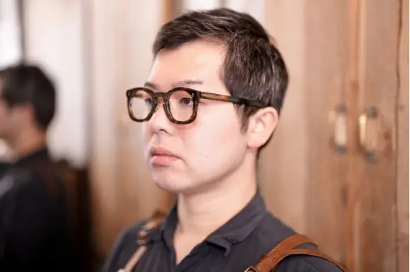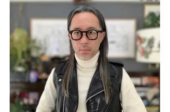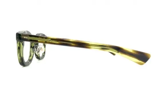 に使用した、存在感のあるセルフレームです。ただボリュームがあるだけではなく、どこか癖のあるライン取りが印象的で、独特な雰囲気をまとった変則ウェリントン型。正面は端正でありながら、掛けるとしっかりと個性が立ち上がります。生地の表情も美しく、クリアレンズはもちろん、カラーレンズを入れてサングラスとしてお楽しみいただくのもおすすめです。厚みのある8mm生地ならではの奥行きが、色味をより引き立ててくれます。
