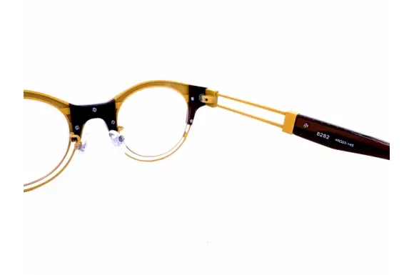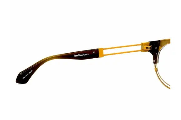 人間以下"をブランド名とするアイウェアブランド、レスザンヒューマン。作りたい物をつくり、道具ではない眼鏡、馬鹿でエロティックでアナーキーな装飾品を目指してクリエイトされます。モデル 8282は、ボストン×ブロースタイルのコンビネーションフレームです。外側は木目調で、WOODに見えますが、アセテートを用いています。印象的な下リムのワイヤー構造は不思議と主張しすぎずに顔になじむ一本です。