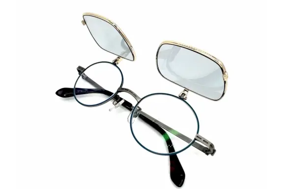 複式跳ね上げフレームとは、2枚のレンズが重なった構造の眼鏡で、外側のレンズ部分を跳ね上げて使い分けができるモデルです。