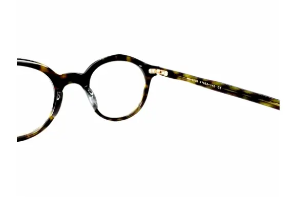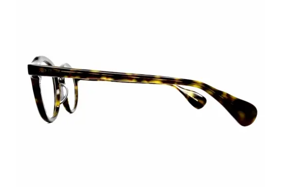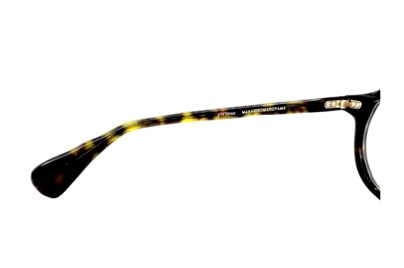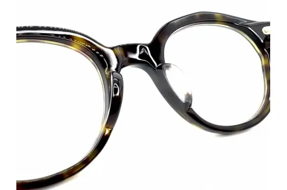 MASAHIROMARUYAMAのMM-0026です。未完成のアートをコンセプトにギミック満載のユニークなアイウェア。“コンセプチュアル”であるが“奇抜”ではない。よく見ると左右非対称のデザインで、ガタガタなアウトラインや、フロントとサイドにひとつずつ取り入れた星形鋲などユニークで個性的なセルフレームです。
