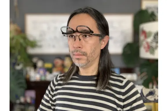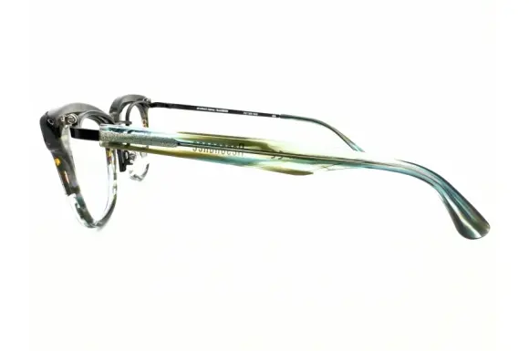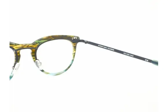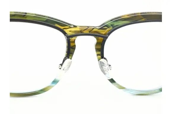 METRONOMEのデザインテイストはそのまま、より「共鳴」しやすくするために生まれたMETRONOMEの新ライン「Resonance」と、“LOVE&JOKE”をコンセプトに展開しているブランドブランド、ALDIES(アールディーズ)のコラボレーションモデル、ILLUSIONです。なんと右枠がボストンシェイプで、左枠がウェリントンシェイプの左右非対称(アシンメトリー)デザインがユニークな、単式跳ね上げフレームです。テンプルまでメタルテンプルとプラスチックテンプルの非対称。生産は中国ですが、作りもデザインも素晴らしく、挑戦的な一本です。