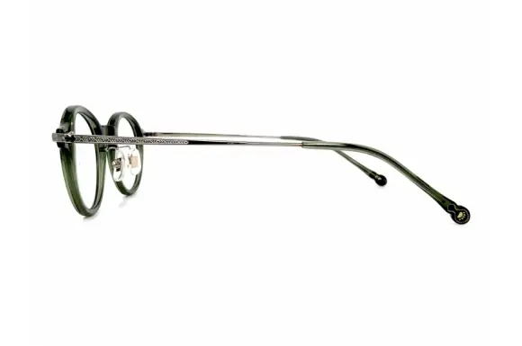 福井県鯖江発、内藤眼鏡の職人の手作業によって製造される、内藤熊八作(ないとう くまはちさく)。クラシカルなデザインをベースに、チタンやセルロイドを用いた高品質な眼鏡は国内外で高い評価を受けています。彫金に日本的なモチーフを取り入れるなど、模様にもこだわったブランド。モデル、N-403はクラシカルでオーセンティックなボストン型のコンビネーションフレーム。美しく上品な印象。メタルパーツはチタンを採用しています。
