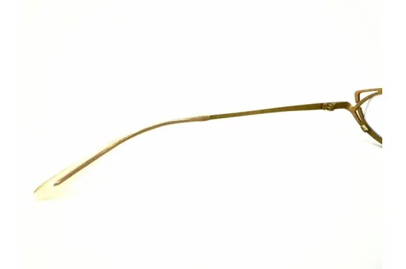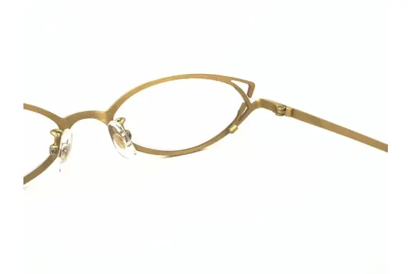 ブランド名、型番など一切の表記が消失しており、データベースからも見つからないため詳細は不明ですが、造りなどからしてもこだわりを感じるオーバル型メタルフレームです。スリットなど空間をデザインに組み込んだお洒落なメタルフレームです。カラーリングも素敵な一本です。