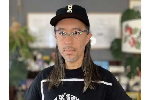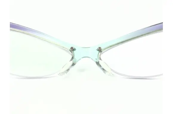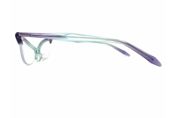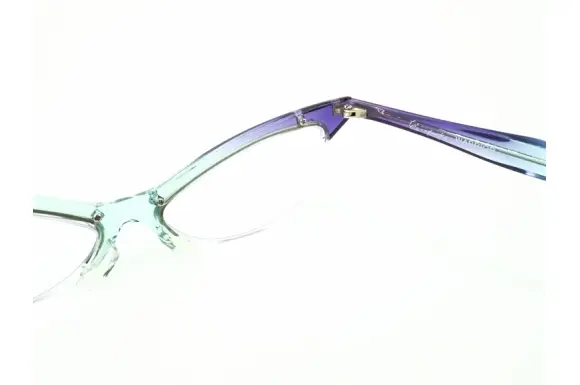 E's: nommckのWARRIORです。とても攻撃的なデザインで、名前通りのデザインが抜群に効いたセルフレーム。急激な角度で上がっていくフロント部分は、まるで、蟷螂が腕を広げているかのよう。フレームカラーはパープル×ライトブルーのグラデーションツートンカラー。インパクト絶大な一本。カラーレンズを入れるとさらに攻撃的になりそうです。