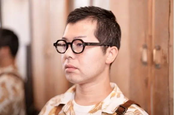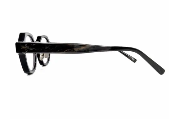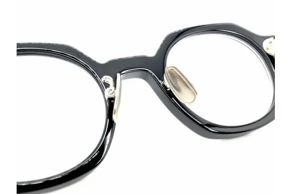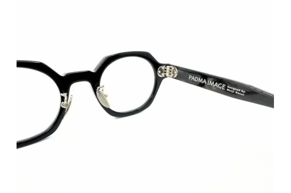 美しい生地づかいに、個性的なデザインが特徴的なブランドPADMA IMAGEのHEXです。パドマとはサンスクリット語で蓮の花。 「蓮は泥より出でて、泥に染まらず」そうでありたいという思いから付けられた名前だそうです。リムのアウトラインは六角形、インラインは丸型の個性派セルフレームです。テレビジョンカット、3点カシメ鋲が効いています。大理石調のテンプルも素敵です。