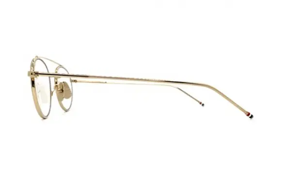 THOM BROWNEのD-BLK-GLD-49です。ツーブリッジデザインが抜群にCOOLで、クラシカルなフルメタルのフレームです。テンプルエンドには、トムブラウンの象徴、トリコロールデザイン。トラディショナルなアイテムにトムらしいひねりを加えた、無二な世界観が素晴らしい一本です。
