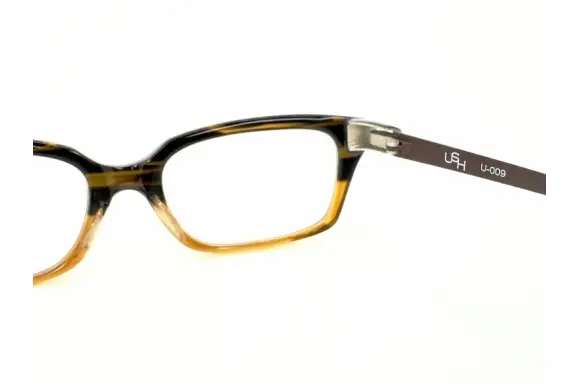 USH(アッシュ)のU-009Maduro 5 Genios。天地幅は浅めでシャープな印象、ガッチリとしたスクエア型のセルフレームで、カッティングデザインがCOOLな一本。チタン製のボックスパーツは、バネ蝶番内臓で、快適にかけていただけます。フロントサイドには、アイコンである角モチーフがあしらわれています。
