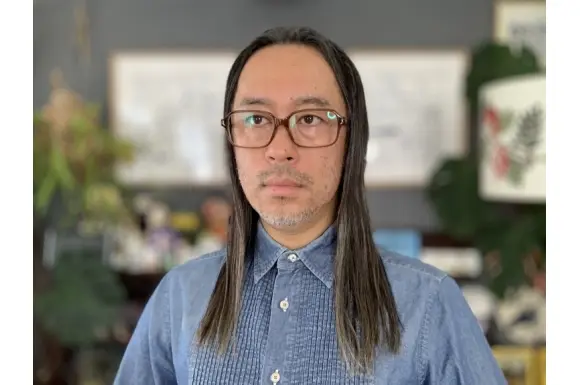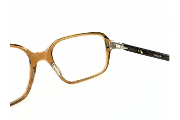 USH(アッシュ)のU-019です。かなり大きくデザインされたフロント枠が、やや癖のあるスクエアセルフレームです。最高に可愛らしく、キャラ感のある一本。フロントの飾り鋲はアイコンである角モチーフで、ポイントになっています。独自の板バネヒンジはデザイン的にも機能的にも効いています。
