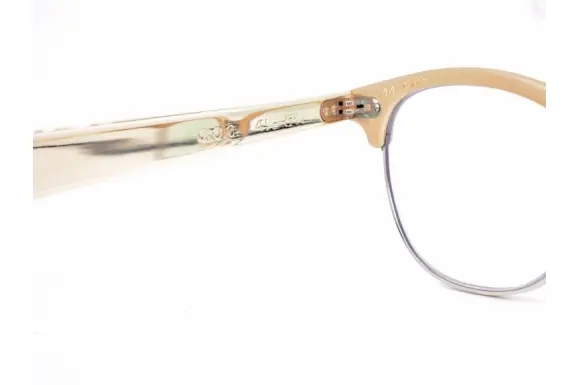 C.O.C.のヴィンテージフレームです。金張り(12KGF)のアルミフレームで、光沢の有無による質感のコントラストや、彫金の意匠が目を引く高級感溢れる一本。デザインはサーモントブロースタイルをフルメタルで仕上げています。吊り目のフォックス型でもあり、妖艶な雰囲気を持った一本です。ヴィンテージ市場でも珍しく、探して出会えるアイテムではないでしょう。