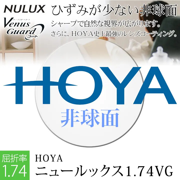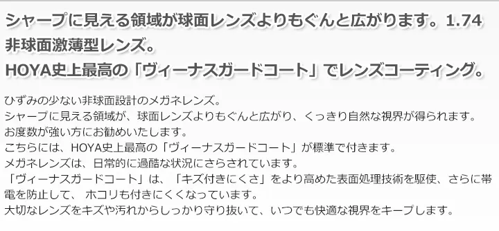 シャープに見える領域が球面レンズよりもぐんと広がります。1.74非球面激薄型レンズ。HOYA史上最高の「ヴィーナスガードコート」が標準