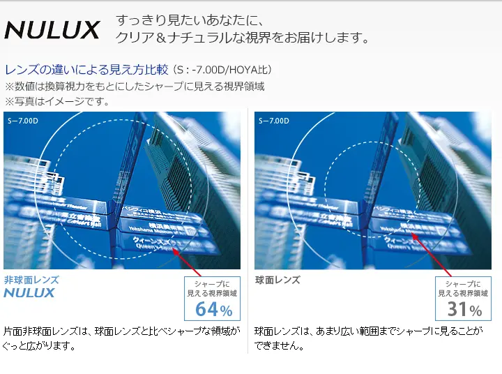 シャープに見える領域が、球面レンズよりもぐんと広がり、くっきり自然な視界が得られます。
