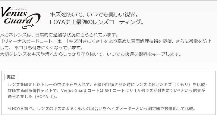 こちらには、HOYA史上最高の「ヴィーナスガードコート」が標準で付きます。なおこちらはすべて、特注レンズになりますので、納期は2週間ほどいただきます。